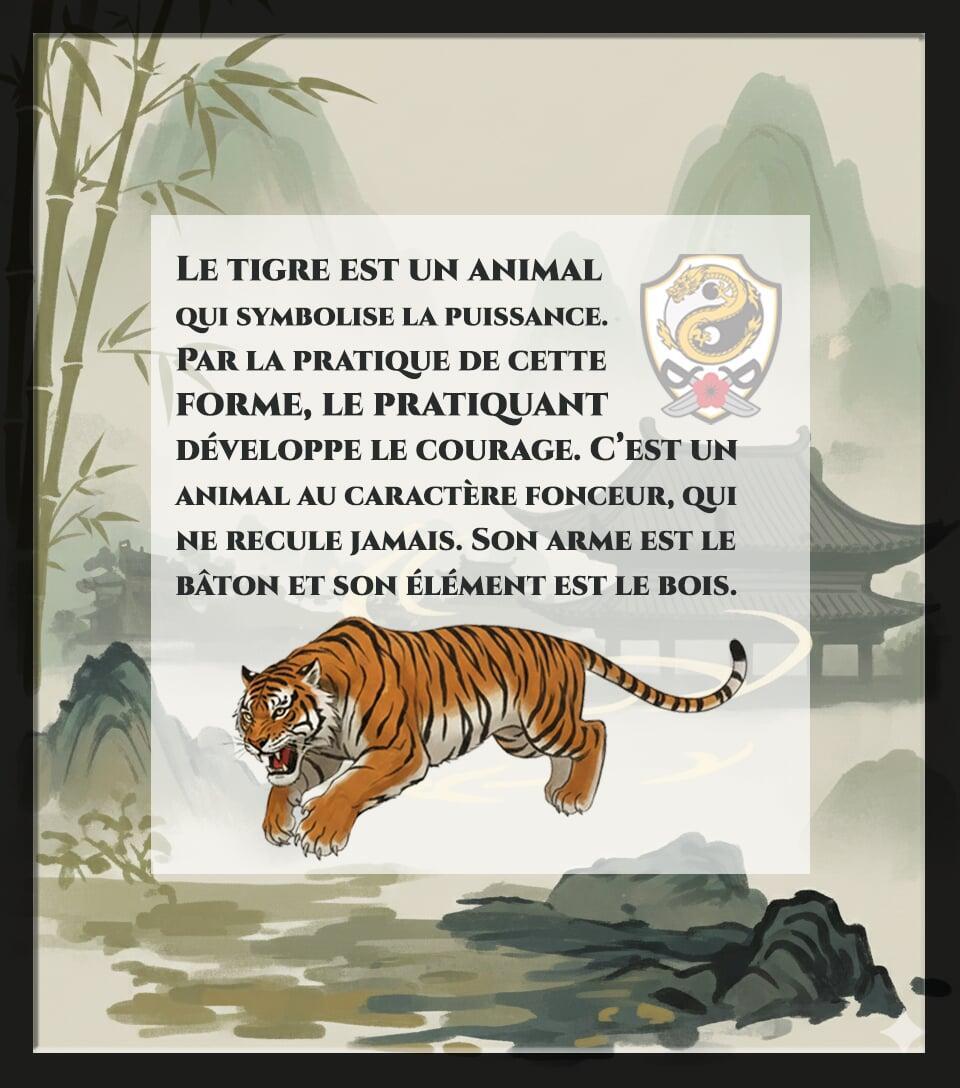 « Le tigre est un animal qui symbolise la puissance. Par la pratique de cette forme, le pratiquant développe le courage. Le tigre est un animal au caractère fonceur, qui ne recule jamais. Son arme est le bâton et son élément est le bois. »