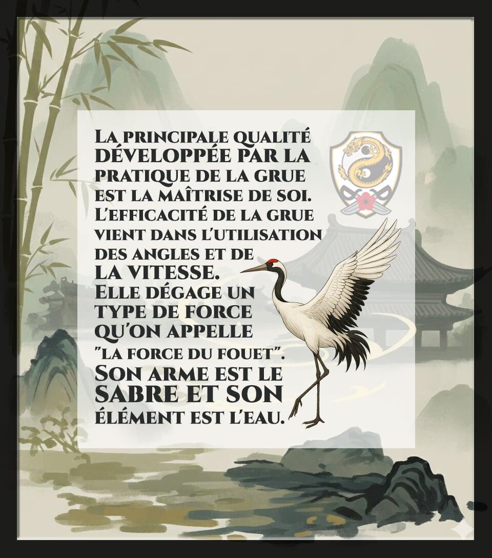 « La principale qualité développée par la pratique de la grue est la maîtrise de soi. L'efficacité de la grue vient dans l'utilisation des angles et de la vitesse. Elle dégage un type de force qu'on appelle "la force du fouet". Son arme est le sabre et son élément est l'eau. »