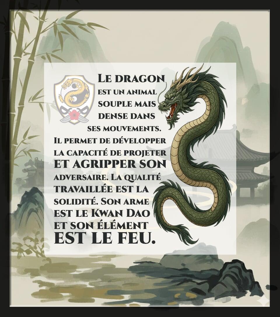 « Le dragon est un animal souple mais dense dans ses mouvements. Il permet de développer la capacité de projeter et agripper son adversaire. La qualité travaillée est la solidité. Son arme est le Kwan Dao et son élément est le feu. »