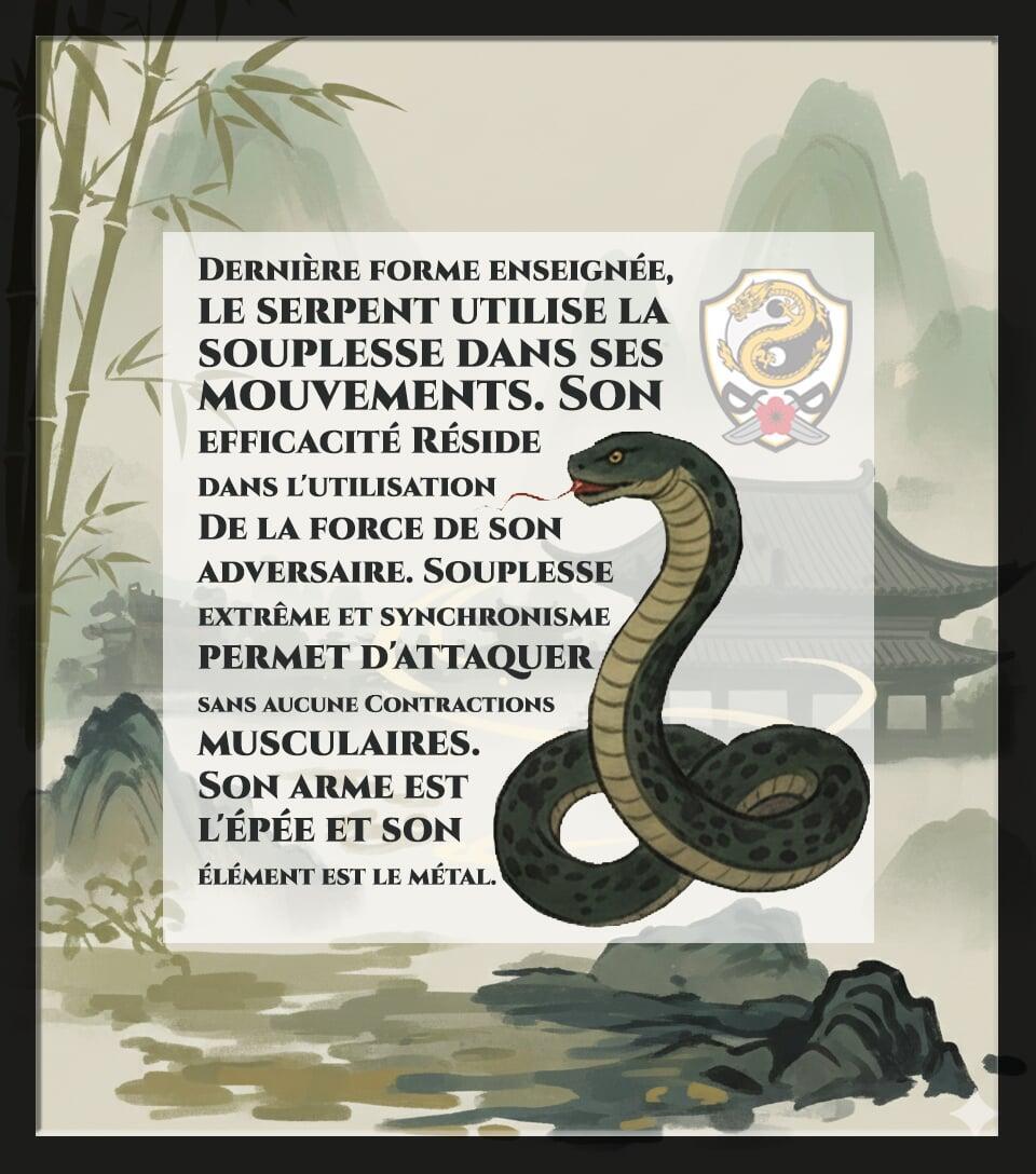 « Dernière forme enseignée, le serpent utilise la souplesse dans ses mouvements. Son efficacité réside dans l'utilisation de la force de son adversaire. Souplesse extrême et synchronisme permet d'attaquer sans aucune contractions musculaires. Son arme est l'épée et son élément est le métal. »